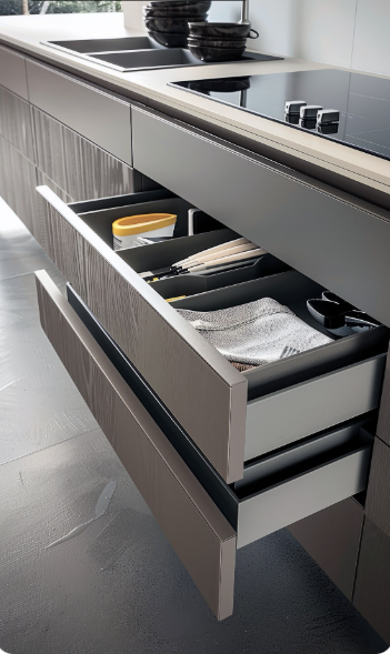 - Фурнитура:бюджетные петли и направляющие или премиальные с доводчиками.